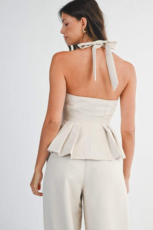 A sophisticated two-piece set featuring a solid deep V halter neckline button-down peplum top paired with matching straight-leg long pants. Fully lined for comfort and a flattering fit.