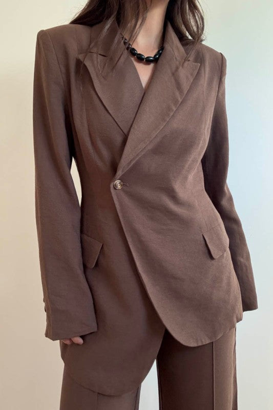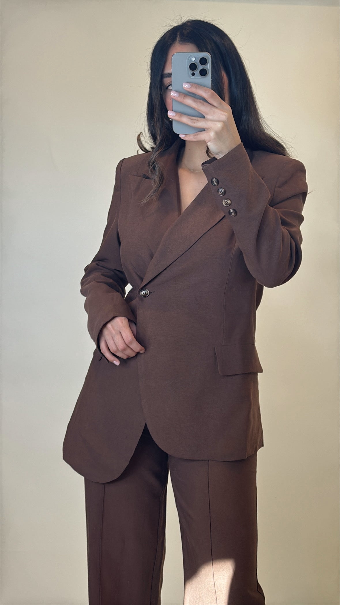A timeless single-breasted blazer in rich café brown, tailored for a structured yet feminine silhouette. The perfect layering piece for elevated everyday style.